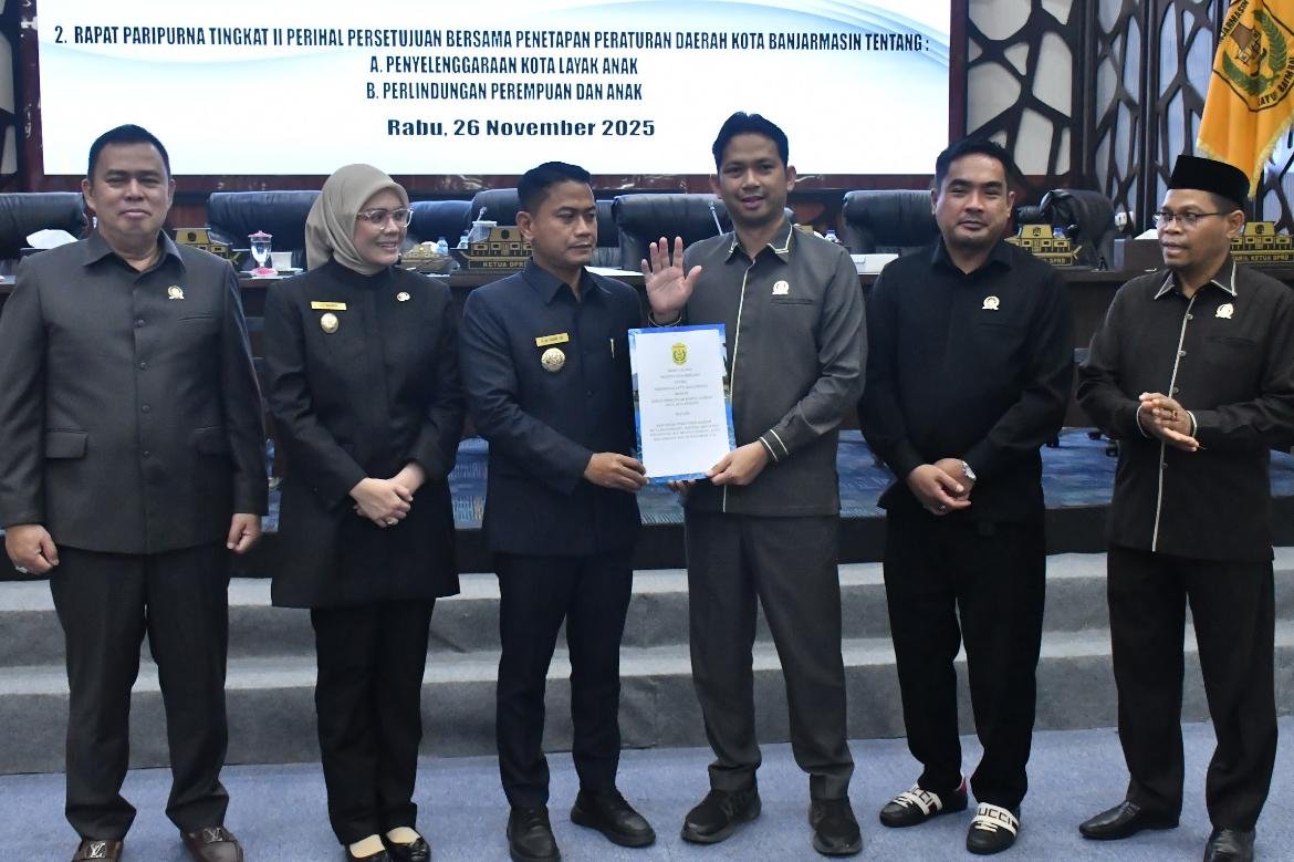Dalam sidang paripurna itu juga diagendakan persetujuan bersama penetapan Perda Kota Banjarmasin tentang Penyelenggaraan Kota Layak Anak serta Perlindungan Perempuan dan Anak yang turut ditandatangani Wakil Wali Kota, Hj. Ananda, bersama jajaran Wakil Ketua DPRD Harry Wijaya, Mathari, dan M. Isnaini.