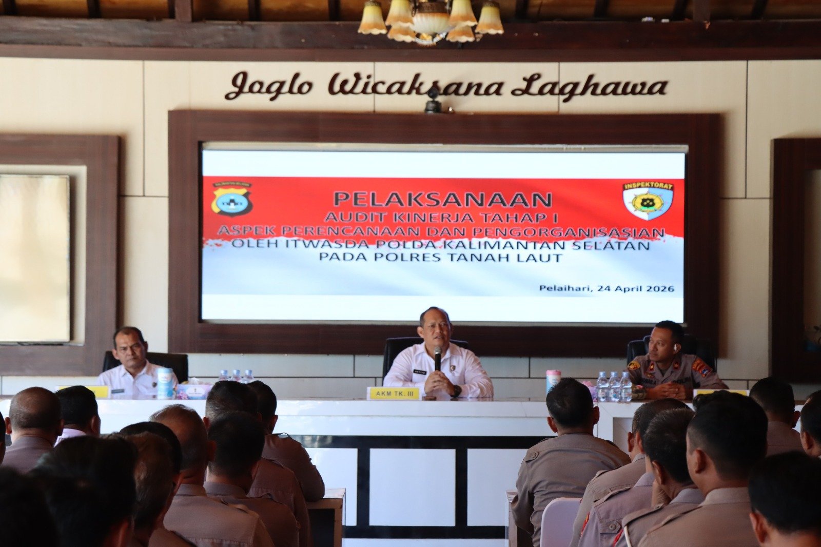 Polres Tanah Laut menerima kunjungan Tim Inspektorat Pengawasan Daerah (Itwasda) Polda Kalimantan Selatan dalam rangka Audit Kinerja Tahap I Tahun Anggaran 2026. Kegiatan yang berlangsung di Joglo Wicaksana Laghawa Mapolres Tanah Laut, Jumat (24/4/2026) pagi, menitikberatkan pada aspek perencanaan dan pengorganisasian.