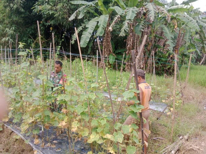 Babinsa Koramil 1002-08/Labuan Amas Utara, Sertu Supono, membantu warga binaannya melaksanakan panen mentimun di Desa Perumahan, Kecamatan Labuan Amas Utara, Kabupaten Hulu Sungai Tengah (HST), Selasa (03/02/2026).