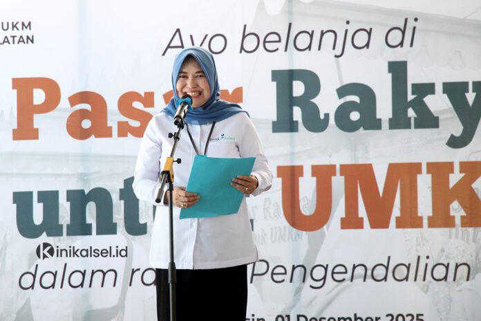 Direktur Kepatuhan Bank Kalsel, Mitra Damayanti, menyampaikan dukungan penuh Bank Kalsel terhadap pelaksanaan Pasar Rakyat untuk UMKM yang digelar di Kantor Kecamatan Banjarmasin Timur, Senin (01/12/2025). Kegiatan ini merupakan program Pemerintah Provinsi Kalimantan Selatan dalam rangka menekan inflasi sekaligus memperkuat ekonomi masyarakat dan UMKM lokal.
