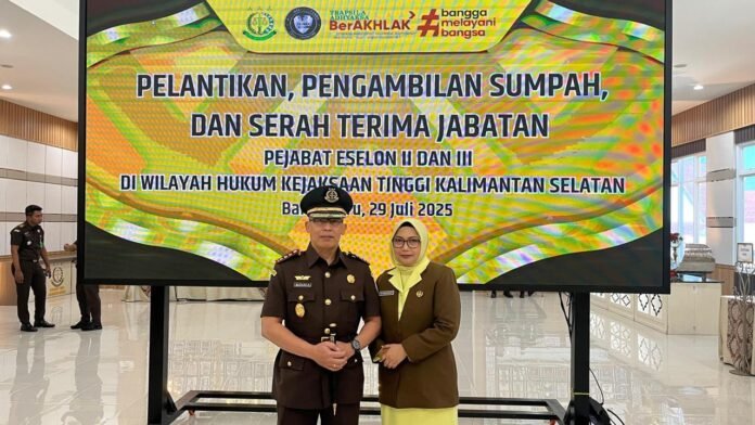 Kepala Kejaksaan Negeri (Kejari) Banjarmasin, Eko Riendra Wiranto, S.H., M.H., resmi menjabat setelah pelaksanaan Pelantikan, Pengambilan Sumpah, dan Serah Terima Jabatan di Aula ST. Burhanuddin, Kantor Kejaksaan Tinggi Kalimantan Selatan (Kejati Kalsel), Selasa (28/7/2025).