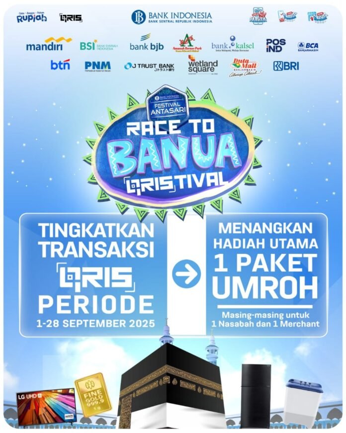 Bank Indonesia Provinsi Kalimantan Selatan kembali menghadirkan program menarik bagi masyarakat, bertajuk “Race to Banua QRIStival 2025”. Program ini berlangsung selama periode 1–28 September 2025 dengan hadiah utama berupa paket Umroh gratis untuk satu nasabah dan satu merchant beruntung.