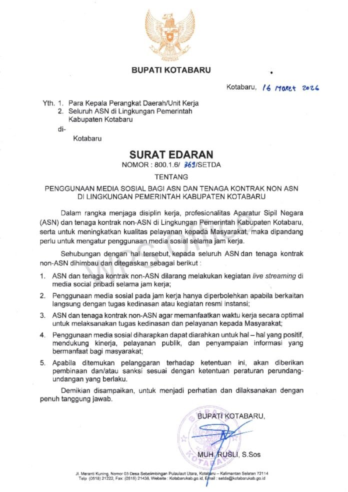 Pemerintah Kabupaten Kotabaru resmi mengeluarkan Surat Edaran Nomor 800.1.6/369/SETDA tentang penggunaan media sosial bagi Aparatur Sipil Negara (ASN) dan tenaga kontrak non-ASN di lingkungan Pemerintah Kabupaten Kotabaru.