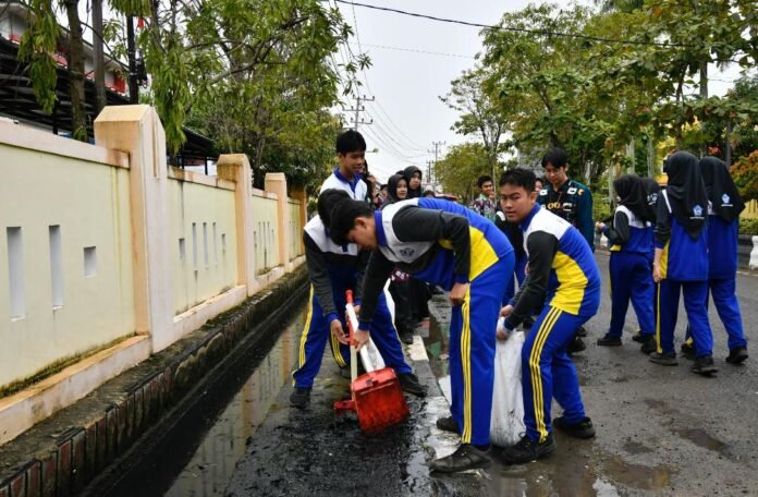 Kamis (29/01/2026) pagi, ratusan pelajar, guru, aparatur kecamatan, hingga pasukan turbo turun langsung membersihkan lingkungan dan selokan dalam rangka menormalisasi aliran drainase yang selama ini terhambat oleh sedimentasi. Bukan sekadar kerja bakti, aksi ini juga merupakan bentuk respons untuk memastikan kawasan padat aktivitas tersebut bebas dari genangan saat intensitas hujan tinggi.