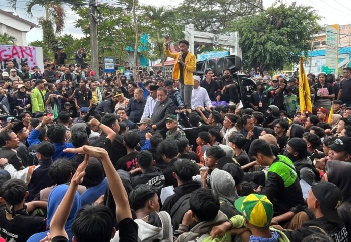 Ketua DPRD Supian HK menemui ribuan demonstran, di depan Gedung DPRD Kalsel, Jalan Lambung Mangkurat.