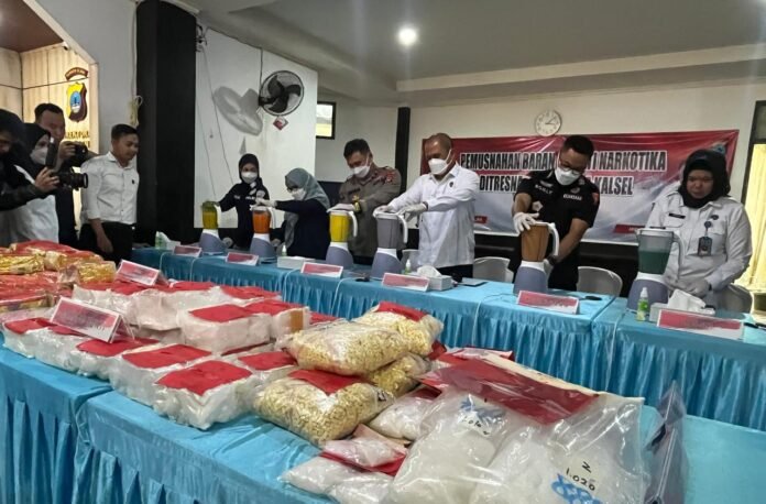Sebanyak 67,6 kilogram sabu, 30.613,5 butir ekstasi, serta 42,98 gram serbuk ekstasi yang merupakan barang bukti hasil pengungkapan Direktorat Reserse Narkoba (Ditresnarkoba) Polda Kalimantan Selatan (Kalsel) dimusnahkan di Direktorat Tahanan dan Barang Bukti Polda Kalsel, Jalan DI Panjaitan, Kota Banjarmasin, Senin (9/2/2026).