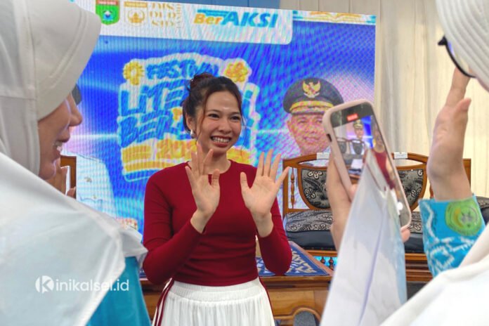 Kreator konten asal Kalimantan Selatan, Gusti Gina, membagikan kisah perjalanan kreatifnya di dunia digital dalam Talkshow Festival Literasi Beraksi yang digelar di Kabupaten Tanah Bumbu, Jumat (17/10/2025).