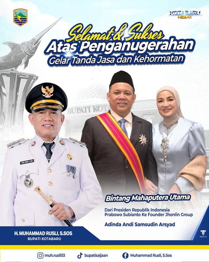 Pemerintah Kabupaten Kotabaru mengucapkan selamat dan mengapresiasi setinggi-tingginya kepada H. Andi Syamsudin Arsyad (Haji Isam), atas Penganugerahan Tanda Kehormatan Bintang Mahaputera Utama oleh Presiden Republik Indonesia.