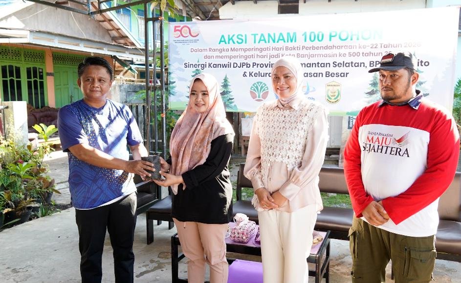 Wakil Wali Kota Banjarmasin, Hj. Ananda, menghadiri kegiatan Aksi Tanam 100 Pohon yang digelar dalam rangka memperingati Hari Bakti Perbendaharaan ke-22, sekaligus menyambut hari jadi ke-500 Kota Banjarmasin, yang berlangsung di kawasan Kelurahan Antasan Besar, Jumat (24/04).