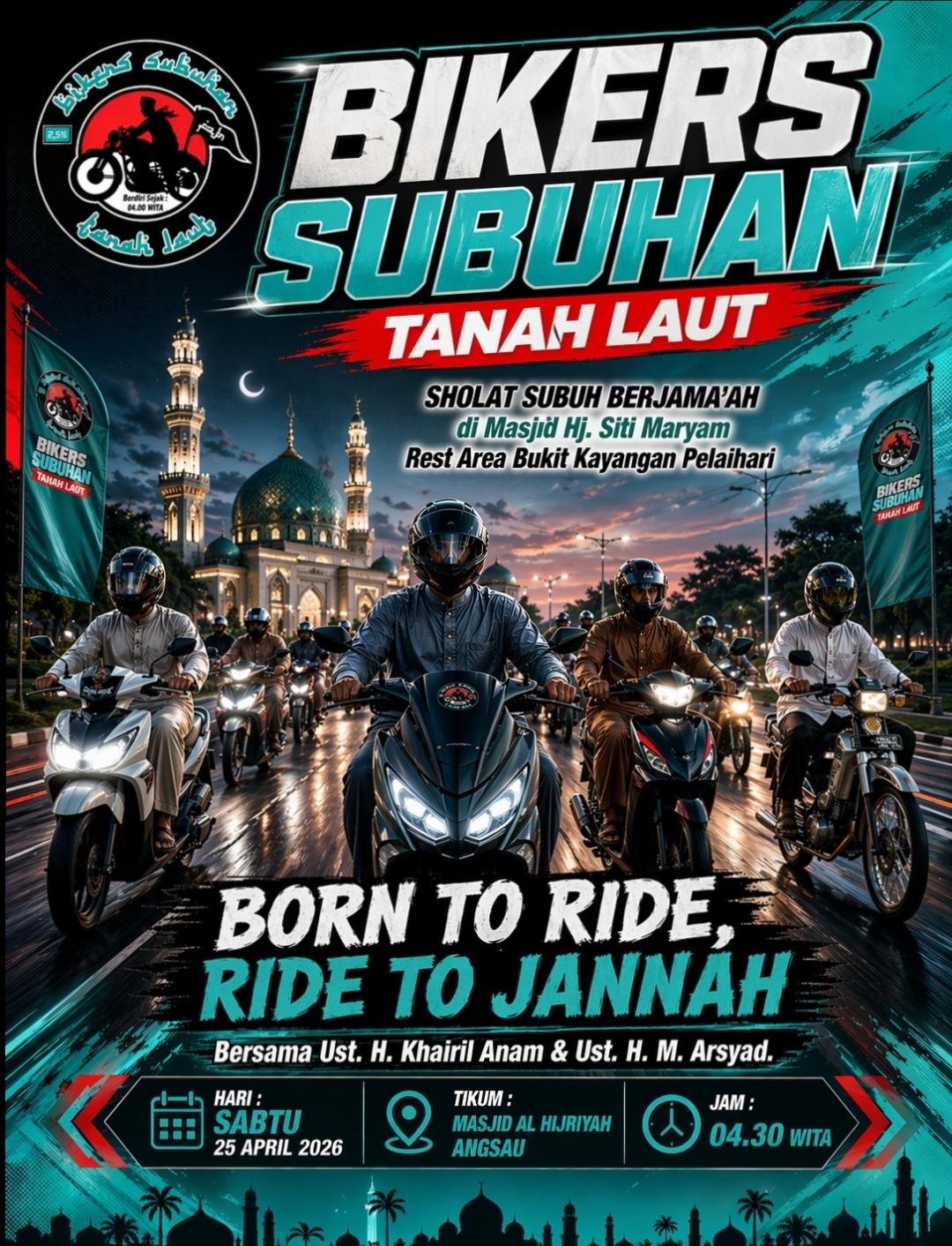 Acara ini juga akan diisi dengan tausiah agama yang menghadirkan Ustaz H. Khairil Anam dan Ustaz H. M. Arsyad. Mengusung semangat “Born to Ride, Ride to Jannah”, kegiatan ini diharapkan menjadi sarana dakwah sekaligus memperkuat nilai kebersamaan di kalangan komunitas motor.