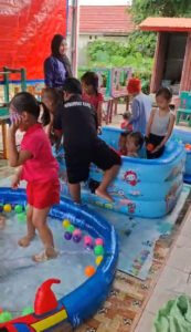 “Hari ini TK Ikal Bulog mengadakan kegiatan puncak tema rekreasi dengan menghadirkan wahana bermain air yang seru dan menyenangkan. Anak-anak diajak merasakan suasana rekreasi seperti di tempat wisata sungguhan,” ujarnya.